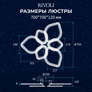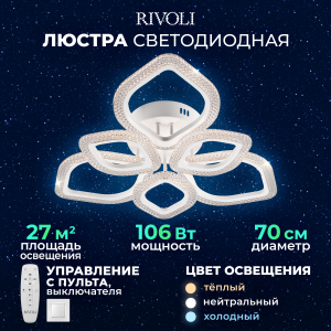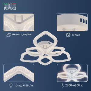 Описание: Светильник-люстра светодиодная с шестью LED плафонами-лепестками – Megan Rivoli (арт. 6110-107). Белый потолочный светодиодный светильник с пультом дистанционного управления. Люстра потолочная светодиодная с регулировкой яркости и цветовой температуры освещения. Мощность этой современной люстры – 106 Вт. Потолочный светодиодный светильник Rivoli Megan подходит для организации основного освещения в гостиной, спальне, в загородном доме, в квартире-студии. Разные режимы свечения светодиодов позволяют комфортно чувствовать себя в пространстве. Коллекцию дополняют люстры LED светодиодные потолочные с пультом – арт. 6110-103, 6110-104, 6110-105, 6110-101, 6110-106. К заказу доступен также настенный светодиодный LED светильник Rivoli Megan – арт. 6110-401.