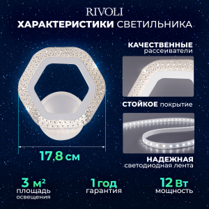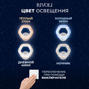 Описание: Эта мощная потолочная светодиодная люстра Rivoli Nikki мощностью 84 Вт предназначена для освещения помещений площадью до 21 м². Регулируемая цветовая температура от 2700 до 6000 К позволяет создавать комфортное освещение в зависимости от времени суток и активности. Режим ночника обеспечивает мягкое освещение в ночное время. Люстра выполнена из акрила, что гарантирует ее долговечность и стильный внешний вид. Светодиоды нового поколения обеспечивают яркий и безопасный для глаз свет. В комплекте все необходимые элементы для установки, включая универсальное крепление для различных типов потолков. Батарейки для пульта не входят в комплект.