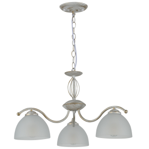 Данная модель – люстра потолочная подвесная с 3 стеклянными матовыми плафонами белого цвета. Корпус люстры с декоративным состариванием окрашен гальваническим способом в белый цвет. Подвес люстры декорирован цепочкой, убрав звенья которой, можно легко отрегулировать высоту люстры при монтаже на потолок. Уютный свет люстры без бликов достигается применением матового стекла при изготовлении плафонов. Источники света в эту современную люстру классического стиля – Е27 40 Вт. |