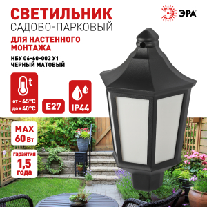 Настенный садово-парковый светильник ЭРА коллекции "Ника" - в чёрном цвете корпуса с матовым рассеивателем. Уличные фасадные светильники ЭРА под лампу с цоколем Е27 (60 Вт) - практичный и эстетичный вариант для основного стационарного освещения придомовых территорий, веранд, беседок. Устанавливаются накладным способом на стены. Могут успешно применяться в качестве декоративной фасадной подсветки. Садово-парковые светильники ЭРА "Ника" выполнены в классическом стиле, имеют аккуратный универсальный дизайн.