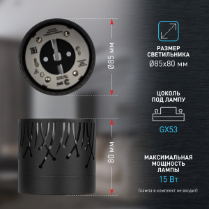 Описание: Накладной светильник OL54 BK делает помещение зрительно более стильным и интересным. Используя по периметру несколько однотипных осветительных устройств, можно сформировать интересные световые геометрические рисунки. Цоколь для источника света GX53, напряжение питания ~230В 50/60Гц, материал металл, цвет светильника черный, размер D85x80мм, максимальная мощность лампы 15Вт, степень защиты IP20