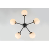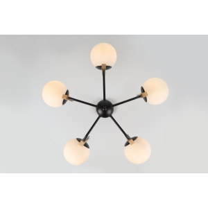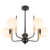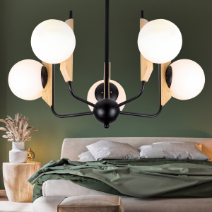Плафоны люстры Rivoli Friede изготовлены из светлого матового стекла и имеют красивую сферическую форму. Арматура этих современных люстр порадует сочетанием черного металла и деревянного декора. На оригинальных рожках-прутьях располагаются 5 плафонов, которые равномерно и ярко освещают площадь 18 м².