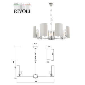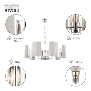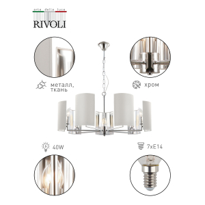 Хромированная минималистичная люстра в стиле современная классика. Люстра потолочная Rivoli Asura (арт. 2076-307) подходит для просторных помещений – применяется с 7 лампами Е14 40 Вт. Для экономии электричества можно установить светодиодные лампочки. В коллекции Rivoli Asura есть аналогичная люстра подвесная под 5 ламп (арт. 2076-305). Коллекцию дополняет бра (арт. 2076-401) и настольный светильник (арт. 7076-501).