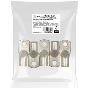Описание: Наконечник кабельный медный луженый ЭРА ТМЛ 240-16-24 используется для оконцевания проводов и кабелей с медными жилами сечением до 300 мм² и применяется для кабелей напряжением до 35 кВ. Предназначен для присоединения кабелей и проводов к медным шинам и выводам электротехнических устройств. Для оконцевания проводников необходимо использовать специальный обжимной инструмент. Наконечники ТМЛ изготавливаются из медной трубы марки М2. Высококачественное лужение с легирующими добавками висмута и олова гарантирует надежную защиту контактных соединений от коррозии (климатическое исполнение Т2). Силовые наконечники ЭРА серии ТМЛ произведены в соответствии с ГОСТ 7386-80.