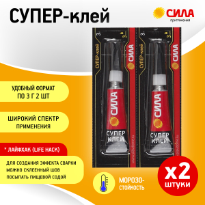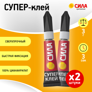 Супер клей СИЛА 3 г набор 2 шт на основе 100% цианакрилата. Суперклей моментально схватывает бытовые и промышленные материалы между собой. Секундный клей хорошо склеивает в любом сочетании: дерево, пробка и пластик. Не пригоден для склеивания полипропилена, полиэтилена, тефлона и стекла. Не рекомендуется использовать при склеивании поверхностей, контактирующих с пищей.