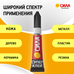 Супер-клей СИЛА, идеально подходит для быстрого и эффективного ремонта различных предметов мебели, интерьера и т.д. Накрепко схватывает дерево, резину, керамику, фарфор и пластик, при этом супер клеи экономично расходуются и высыхают за несколько секунд. |