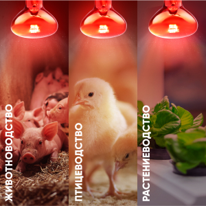 Инфракрасная зеркальная лампа с красной колбой. Активно используется в животноводстве, птицеводстве и растениеводстве. Максимальная тепловая мощность без яркого света. Идеальна для стабилизации теплового баланса новорождённых и молодых животных. 100 % энергии переходит в тепловую. Работа лампы не зависит от скачков сети, микроимпульсов. Не требуются стабилизаторы напряжения – лампа работает даже при пониженном напряжении. Мгновенно включается и нагревается. Минимум пульсаций освещения. Компактные размеры (удобно при транспортировки и использовании). Используется только с керамическими цоколями (не с пластиковыми!). |
