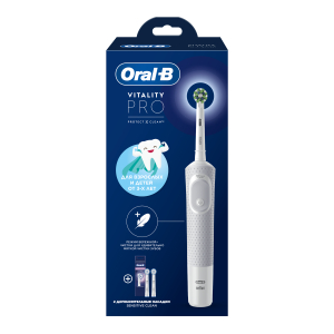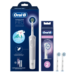 В комплекте: сменная насадка Cross Action+2 сменные насадки Sensitive Clean с щетинками, меняющими цвет от зеленого до желтого, подсказывая, когда ее пора заменить, 1 зарядное устройство, 1 электрическая зубная щетка Vitality Pro.