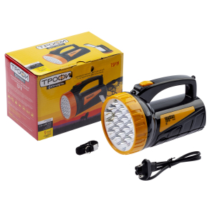 Мощный фонарь прожектор от компании Трофи незаменимый вариант для работы, активного отдыха или ремонта. Одним из главных плюсов светодиодного фонаря является корпус из ударопрочного пластика. Он устойчив к падениям, тряске, неприхотлив в уходе. 37 светодиодов освещают пространство на максимальное расстояние в 100 м. Световой поток с нейтральным белым свечением равен 160 лм. Кемпинговый фонарь имеет встроенный аккумулятор, время непрерывной работы составляет 9 часов. Зарядное устройство входит в комплект. Уникальная особенность аккумуляторного фонаря встроенный в корпус светильник. Складная подвижная конструкция позволяет индивидуально настроить освещение. Данный фонарь мощностью 2,7 Вт удобно брать с собой. Он имеет эргономичную ручку, хорошо лежит в руке. В комплекте также предусмотрен ремешок, который можно закрепить на крючки в корпусе. Устройство всегда будет под рукой! Высокая степень защиты от пыли и влаги позволит использовать устройство в экстремальных условиях.