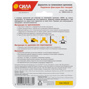 1. Подготовьте поверхность, предварительно очистив и высушив её. 2. Удалите защитную плёнку с рабочей поверхности силиконовой подложки крючка. 3. Приложите рабочую часть к подготовленной поверхности и сильно прижмите на центр крючка, надавливая на силиконовую часть от центра к краям, удалите оставшиеся воздушные пузырьки. 4. Проверьте фиксацию крючка приложив небольшое усилие. 5. Через 30 минут крючок можно использовать с полной нагрузкой. Удаление или перемещение: 1. Подцепите край силиконовой подложки и аккуратно отделите её от поверхности. 2. Для размещения держателя на новом месте повторите пункты из инструкции по приклеиванию. НЕ ПРЕДНАЗНАЧЕН ДЛЯ ИСПОЛЬЗОВАНИЯ НА РЕЛЬЕФНЫХ ПОВЕРХНОСТЯХ. |