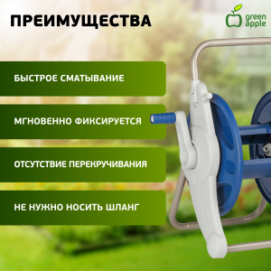 Описание: Тележка GREEN APPLE GWHR6-050 предназначена для переноса и хранения шланга. Вместимость при 12 мм (1/2”) до 35 метров садового шланга. Компактная и надежная конструкция. Собирается и разбирается просто и без инструментов (click and lock). Удобное хранение шланга с насадками на боковой раме. Эргономичная ручка позволяет легко сматывать шланг на барабан. Практичные материалы имеют высокую износостойкость. С садовыми аксессуарами от компании GREEN APPLE работа в саду всегда в удовольствие!