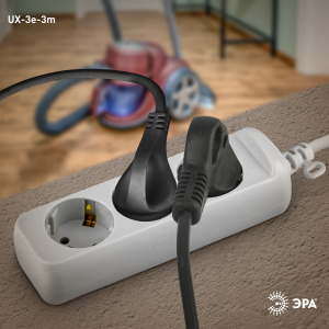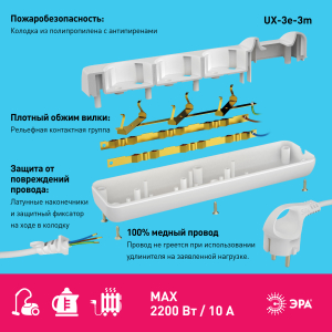 Описание: Удлинитель электрический Эра UX-3e-3m с заземлением, ПВС, 3x0,75мм2, 3 розетки, 3 м. Рассчитан на максимальную мощность 10А/2200 Вт. Удлинитель Эра станет Вашим надежным помощником, если Ваши любимые электроприборы находятся далеко от розеток. Провод в удлинителях Эра сделан из 100% меди, что делает его абсолютно пожаробезопасным. Корпус выполнен из ударопрочного и негорючего пластика (полипропилен). Вилка обеспечена кольцом для удобного извлечения ее из розетки. Модель удлинителя на 10А позволяет подключить бытовые приборы общей нагрузкой до 2200Вт. Дизайн удлинителя разработан в России командой Эра Style.