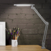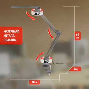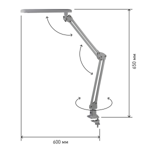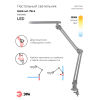 Настольный светильник со светодиодами (LED) в качестве источников света. Теплый свет, аналогичный свету лампы накаливания - цветовая температура 3000К. Выключатель на плафоне. Высота плафона регулируется двухсекционной сгибающейся стойкой. Модель на струбцине. |