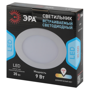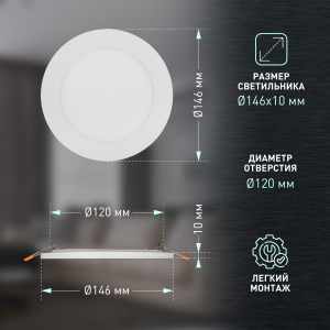 Описание: Круглый светодиодный светильник LED 1-9-4K - эффектное решение для любой комнаты в вашем доме! Светодиодный светильник можно использовать как в качестве основного освещения, так и для создания акцентов в определенных зонах комнаты. Благодаря скрытой части корпуса светильники можно встраивать в потолок или стены, создавая разный стиль помещений. Светильник ЭРА с приятным дизайном подойдет для помещений с разным интерьером: от лофта до модерна, классицизма или минимализма. Цветовая температура составляет 4000К, она оптимальна для глаз и не заставляет их испытывать дискомфорт. Максимальная мощность лампы – 9 Вт. Корпус встраиваемого светильника изготовлен из ударопрочного алюминия, что делает его особенно удобным в использовании, а благодаря матовому стеклу, защищающему лампу, свет рассеивается и становится мягким. Диаметр отверстия, требуемого для установки светильника составляет 120 мм, а диаметр самого светильника – 146 мм. Купив точечный светильник бренда ЭРА, вы останетесь довольны и сможете создать приятную атмосферу в доме!