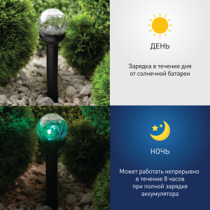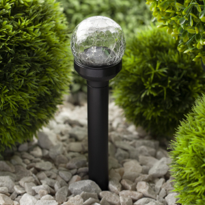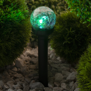 Описание: Светильник-втыкашка Кракле, в ПРОМОБОКСЕ. Диаметр стеклянного шарика 5,5 см. Основание - пластик. RGB светодиод. Поставляется в промоупаковке по 12 шт. Обращаем Ваше внимание, что перед использованием фигурки её необходимо включить и зарядить. Светильник заряжается в течение всего светового дня.