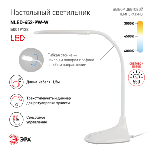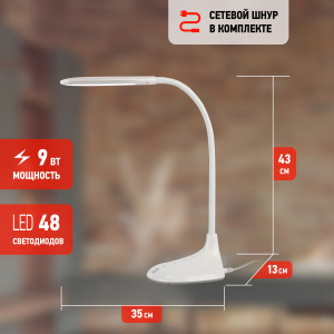 Светильник со светодиодами (LED) в качестве источников света. Выбор цветовой температуры - 3 цвета: 3000К, 4500К, 6000К. Сенсорное переключение. Пятиступенчатый диммер для регулировки яркости. Гибкая стойка - наклон и поворот плафона в любом направлении. |