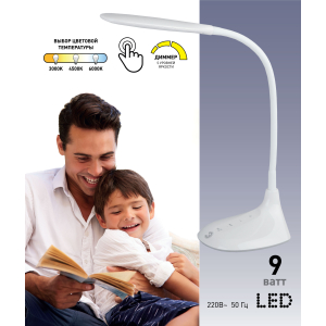 Светильник со светодиодами (LED) в качестве источников света. Выбор цветовой температуры - 3 цвета: 3000К, 4500К, 6000К. Сенсорное переключение. Пятиступенчатый диммер для регулировки яркости. Гибкая стойка - наклон и поворот плафона в любом направлении. |