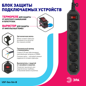 Описание: Сетевой фильтр ЭРА USF-5es-5m-B гарантирует высокую степень защиты короткого замыкания. Фильтр имеет терморазмыкатель на 10 А, что защищает подключенные бытовые приборы от перегрузки. Данные характеристики обеспечивают надежную защиту подключенной техники. Современный дом немыслим без большого количества приборов, потому наличие сетевого фильтра, у которого предусмотрено 5 розеток, особенно необходимо. Мощность фильтра составляет 2200 Вт, что обеспечивает надежную бесперебойную работу всех подключенных устройств. На корпусе расположен выключатель с подсветкой, позволяющий быстро задавать фильтру необходимый режим работы. Модель может эксплуатироваться как удобный удлинитель, так как длина провода фильтра составляет 5 м. Сетевые фильтры разрабатываются собственным техническим бюро, проходят проверку на всех этапах производства, что обеспечивает высокое качество продукта.