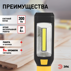 Описание: ЭРА Практик RB-801 - многофункциональный светодиодный фонарь с режимом светильника и двумя типами крепления. Корпус сгибается в двух направлениях (по 90 градусов каждое). На торце - мощный магнит. Дополнительный магнит расположен на задней стороне фонаря. Имеется удобный прочный крючок. Закрепив ЭРА RB-704 на нужной поверхности, можно быстро настроить необходимый для работы угол освещения. Переключение режима превращает фонарь в светильник c ближним заливающим светом. Фонарь ЭРА Практик RB-801 незаменим как при профессиональных работах (строительство, ремонт, монтаж, обслуживание), так и в частном использовании (работы в доме, на приусадебном участке, путешествия). Покрытие корпуса - софт-тач (мягкое, приятное на ощупь, без скольжения). Основной режим освещения - яркая LED-плата СОВ (5 Вт). Сопутствующий - 3 диода на торце с направленным лучом длиной до 20 метров. Сверхмощные светодиоды COB ("chip on board" - "кристалл на плате") ранее применяли исключительно в промышленном освещении, сейчас технологию удалось адаптировать под универсальные цели. Получился яркий и при этом мягкий ровный свет. Одного комплекта батареек (3 мизинчиковые) хватит на 12 часов непрерывной работы.