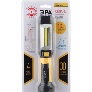 ЭРА Практик RB-801 - многофункциональный светодиодный фонарь с режимом светильника и двумя типами крепления. Корпус сгибается в двух направлениях (по 90 градусов каждое). На торце - мощный магнит. Дополнительный магнит расположен на задней стороне фонаря. Имеется удобный прочный крючок. Закрепив ЭРА RB-704 на нужной поверхности, можно быстро настроить необходимый для работы угол освещения. Переключение режима превращает фонарь в светильник c ближним заливающим светом.