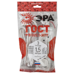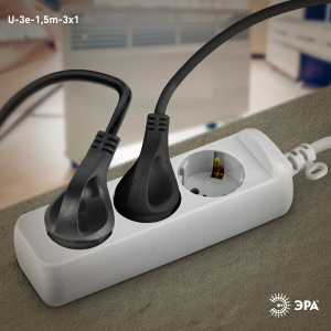 Описание: Удлинитель электрический Эра U-3e-1,5m с заземлением, ПВС, 3x1мм2, 3 розетки, 1,5м. Рассчитан на максимальную мощность 16А/3500 Вт. Удлинитель Эра станет Вашим надежным помощником, если Ваши любимые электроприборы находятся далеко от розеток. Провод в удлинителях Эра сделан из 100% меди, что делает его абсолютно пожаробезопасным. Корпус выполнен из ударопрочного и негорючего пластика (полипропилен). В моделях с заземлением у вилки есть кольцо для удобного извлечения из розетки. Модель удлинителя на 16А позволяет подключить мощные бытовые приборы общей нагрузкой до 3500Вт. Не бойтесь включить чайник, обогреватель, микроволновку или другие электроприборы. Толстый провод удлинителя Эра гарантирует полную безопасность. Дизайн удлинителя разработан в России командой Эра Style.
