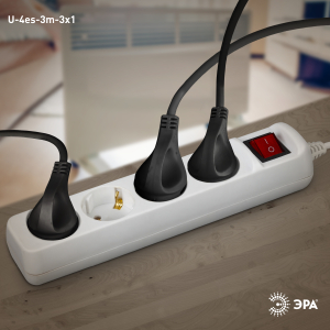 Описание: Удлинитель электрический Эра U-4es-3m с заземлением, с выключателем, ПВС, 3x1мм2, 4 розетки, 3 метра. Рассчитан на максимальную мощность 16А/3500 Вт. Удлинитель Эра станет Вашим надежным помощником, если Ваши любимые электроприборы находятся далеко от розеток. Провод в удлинителях Эра сделан из 100% меди, что делает его абсолютно пожаробезопасным. Корпус выполнен из ударопрочного и негорючего пластика (полипропилен). В моделях с заземлением у вилки есть кольцо для удобного извлечения из розетки. Модель удлинителя на 16А позволяет подключить мощные бытовые приборы общей нагрузкой до 3500Вт. Не бойтесь включить чайник, обогреватель, микроволновку или другие электроприборы. Толстый провод удлинителя Эра гарантирует полную безопасность. Дизайн удлинителя разработан в России командой Эра Style.