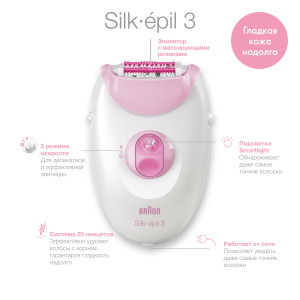 Описание: Эпилятор Braun Silk-épil 3 3-321, для сухой эпиляции, с триммером для бикини и подсветкой, белый Полное название продукта Эпилятор Braun Silk-épil 3 3-321, для сухой эпиляции, с триммером для бикини и подсветкой, белый Модель 3-321 Бренд Braun Категория Эпилятор Описание товара Электрический эпилятор Braun Silk-épil 3 3-321 обеспечивает гладкость кожи надолго, бережно удаляя волосы с корнем. Он удаляет даже очень короткие волоски, не травмируя при этом кожу. Эпилирующая головка оснащена массажными роликами для уменьшения дискомфорта, поэтому эпилятор бережно удаляет волосы даже в чувствительных зонах, таких как подмышки и область бикини. Подсветка SmartLight позволяет увидеть и удалить даже самые тонкие волоски. Эпилирующая головка оснащена 20 пинцетами из нержавеющей стали, которые эффективно удаляют волосы с корнем для получения идеальной гладкости ног, рук, лица и всего тела. Питание от сети гарантирует непрерывную работу, а 2 режима скорости (для деликатного и быстрого удаления волос) помогают адаптировать прибор под любой тип кожи. Особенности модели: - Включает в себя систему из 20 пинцетов для бережного удаления волос и обеспечения гладкости кожи надолго. - Массажные ролики на эпилирующей головке плавно стимулируют и массируют кожу, чтобы уменьшить дискомфорт при эпиляции. - Подсветка SmartLight позволяет увидеть и удалить даже самые тонкие волоски, а 2 режима работы - выбрать оптимальную скорость. В комплект входят: триммер для линии бикини и щёточка для чистки эпилятора. Braun - бренд №1 в России среди эпиляторов. *По данным ведущих компаний на рынке маркетинговых исследований, Россия, данные розничной торговли на рынке эпиляторов за 2020 г., продажи в стоимостном выражении. Тип товара эпилятор Линейка silk-épil 3 Обрабатываемая поверхность ноги, подмышки, тело, зона бикини Способ применения сухая эпиляция Противопоказания / Меры предосторожности в целях соблюдения гигиены не позволяйте другим людям пользоваться вашим прибором. этот приб
