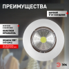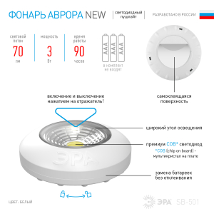 Описание: Фонарь SB-501 пушлайт "Аврора" - светодиодный самоклеящийся фонарь-подсветка, который включается простым нажатием руки. В фонаре использованы светодиоды нового поколения, который светят мягким светом, не мерцают, не нагреваются и имеют длительный срок службы, не нуждаются в замене. Эти светодиоды светят ярким белым светом и намного энергоэффективнее обычных. Дальность луча составляет 5 метров.Это удобный и практичный фонарь, который можно использовать для декоративного освещения в качестве подсветке или как аварийный свет. Фонарь выполнен в лаконичном дизайне в базовом белом цвете из ударопрочного экологичного пластика. Фонарь не требует установки, достаточно отклеить стикер от самоклеящейся поверхности и приклеить фонарь туда, где требуется дополнительное освещение. Компактные размеры позволяют приклеить фонарь на любые плоские поверхности, такие как лестницы, коридоры, прихожие, шкафы, тумбочки, кладовки. Он также подходит для машин, лодок и кемпинга. Фонарь работает от батареек, которые очень легко сменить, не отклеивая фонарь, а лишь открутив корпус.