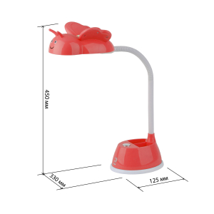 Светильник со светодиодами (LED) в качестве источников света. Направление света регулируется поворотом плафона в любом направлении под любым углом. Теплый свет, аналогичный свету лампы накаливания - цветовая температура 3000К. Удобная подставка на основании поможет всегда иметь ручку, карандаши или линейку под рукой. Детский дизайн плафона в виде пчелки. |