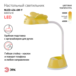 Светильник со светодиодами (LED) в качестве источников света. Направление света регулируется поворотом плафона в любом направлении под любым углом. Теплый свет, аналогичный свету лампы накаливания - цветовая температура 3000К. Удобная подставка на основании поможет всегда иметь ручку, карандаши или линейку под рукой. Детский дизайн плафона в виде пчелки. |