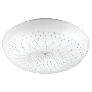 Плафон электросветильника имеет неповторимый дизайн. Декор в виде узорчатой сетки гармонично сочетается с круглым корпусом. Крохотные звезды, разбросанные по окружности рассеивателя, придают динамики. Такая потолочная люстра идеально подойдет для оформления детской, гостиной или спальни.