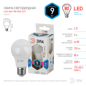 Описание: Эта светодиодная лампа ЭРА Серии Стандарт - современный, качественный и доступный источник света. Позволяет экономить до 90% электроэнергии по сравнению с лампой накаливания с аналогичным световым потоком. Светит ярким белым светом, который максимально приближен к естественному дневному. Идеальна для ежедневного применения в быту. Мгновенное включение. Ровное освещение. Можно использовать как с люстрами, так и со светильниками, в том числе настольными и бра.