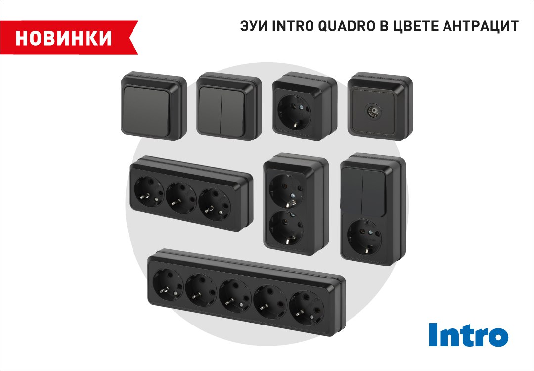 Полная линейка электроустановочных изделий торговой марки Intro серии Quadro доступна к заказу в популярном цвете антрацит.