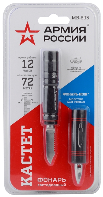 Компактный фонарь-трансформер: под откручивающейся ручкой-молотком для стекла прячется нож с двусторонним лезвием - классическим и рифлёным. Длина лезвия - 4,5 см. Это надёжный, стильный и функциональный фонарь, изготовленный из анодированного алюминия. Прочный корпус с противоскользящими вставками - не выскользнет из рук в нештатной ситуации. Дополнительный бонус - фирменный логотип Армия России. Фонарь даёт луч повышенной дальности (72 метра!) и работает от одной пальчиковой батарейки в течение 72 активных часов.