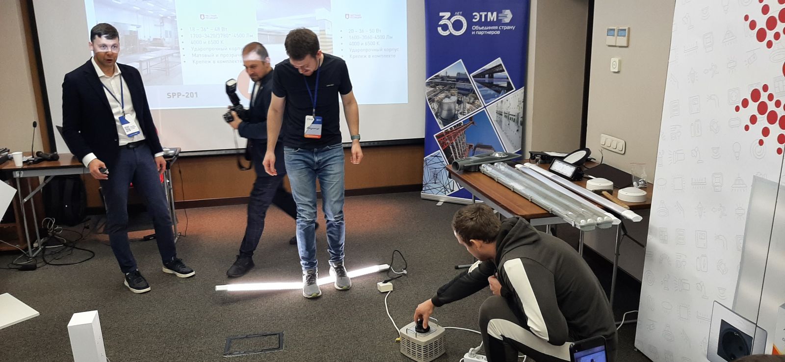 Для участников конкурса команда ЭРА подготовила презентации товаров в интересном формате - с демонстрацией образцов самых актуальных новинок и краш-тестами антивандальных светильников. Электрики и монтажники получили возможность прямо на мастер-классе собрать креативные световые композиции из дизайнерских LED-светильников ЭРА Geometria. На технические противоударные светильники участники "Лиги профессионалов ЭТМ" вставали ногами (по одиночке и по двое взрослых мужчин!), прыгали по ним, били молотками, бросали с высоты. Антивандальная продукция ЭРА успешно выдержала все испытания и получила высокую оценку профессиональных электриков.