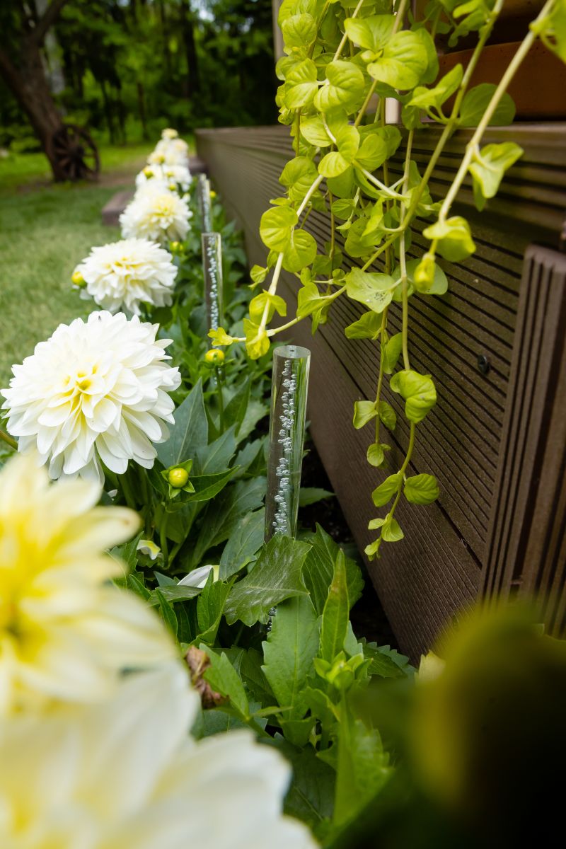 Необычными светильниками от ЭРА декорировали посадки георгинов в зоне отдыха у бани. В дневное время они выглядят очень лаконично, не отвлекают внимание от красоты цветов, являясь стильной аккуратной изюминкой клумб.