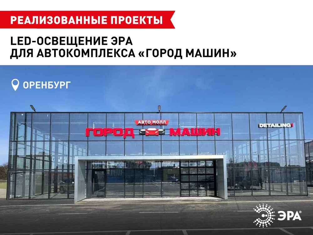 Современные уличные светодиодные светильники ЭРА установлены на территории автокомплекса «Город машин» — крупнейшего в Оренбурге центра по продаже и обслуживанию автомобилей.