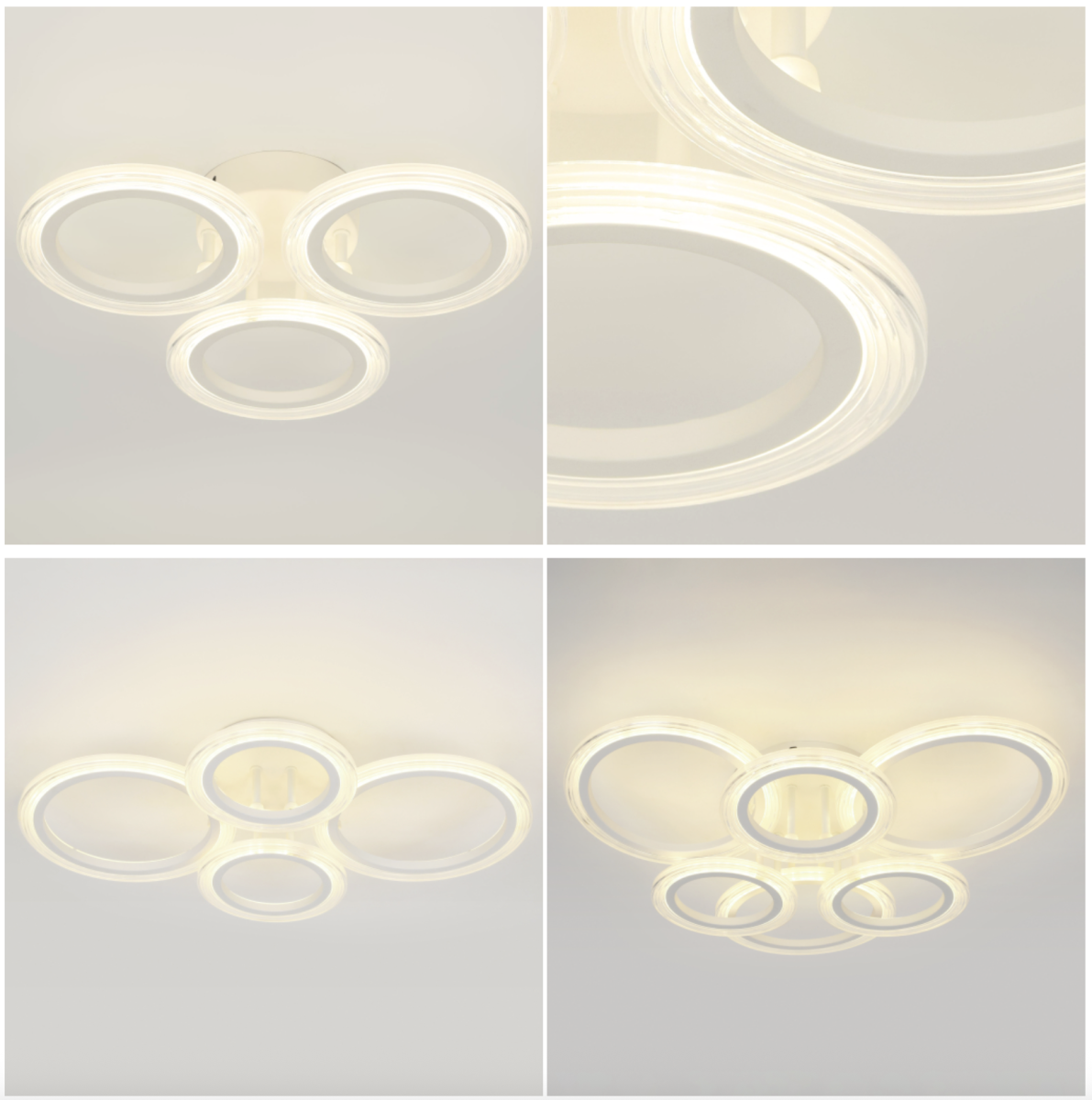 Коллекция состоит из трёх лаконичных потолочных люстр с разным количеством кольцевых плафонов: Б0069742 — 3 плафона (мощность — 39 Вт), Б0069748 — 4 плафона (мощность — 59 Вт), Б0069749 — 6 плафонов (90 Вт). Светильники выполнены в базовом белом цвете.